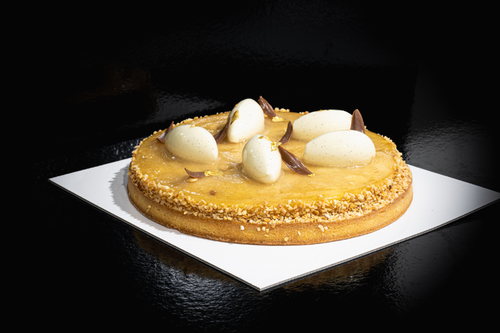 Pâte sucrée, crème d’amande au zeste de citron, crémeux citron, biscuit amandes, bavaroise menthe poivrée / huile d’olive