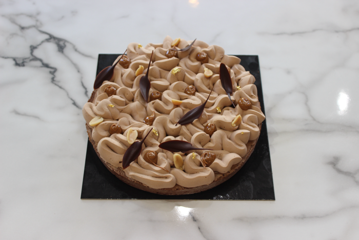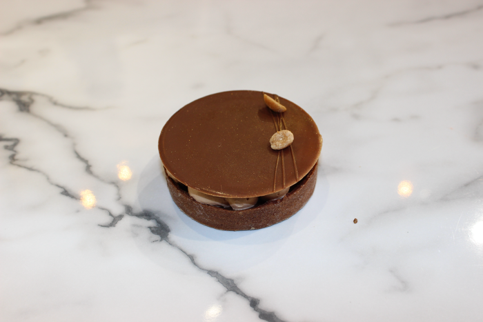 Pâte sucrée cacao, crémeux chocolat noir 66%, praliné cacahuète, ganache montée au chocolat au lait.