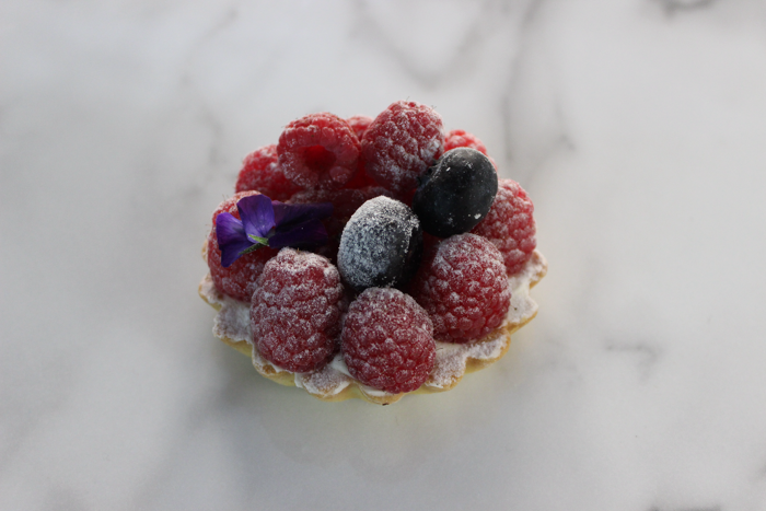 Pâte sucrée, crème d’amande, ganache montée vanille, confit fruits de saison , fruit frais de saison