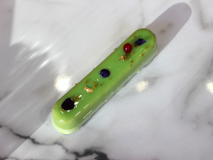 Biscuit amande, compoté framboise citron vert, mousse pistache.